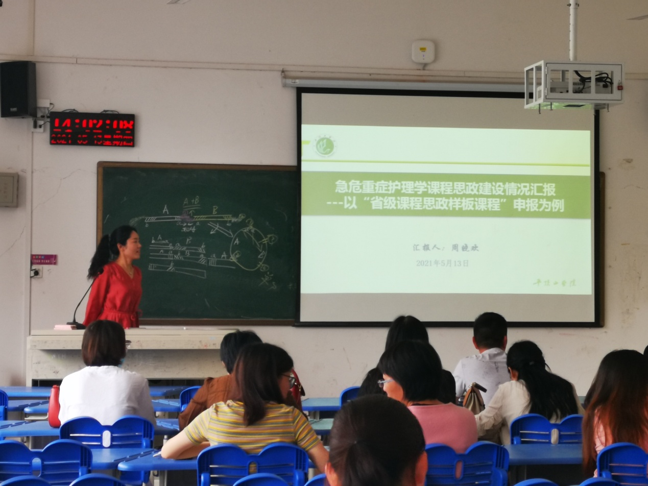 首先,护理系周晓欢老师以急危重症护理学课程建设为例,分享了申报省级“战疫”类课程思政样板课程的宝贵经验。周晓欢老师分别从建设基础、目标方法、建设效果、建设规划等方面,详细介绍了急危重症护理学课程思政建设情况和申报书填写的技巧。临床医学系杨笑怡老师以“将课堂交还学生---‘团队互助’教评学在实践课中的应用”为题,分享了“团队互助”教评法的理论基础、实训课中的实践经验及遇到的困难及解决办法。