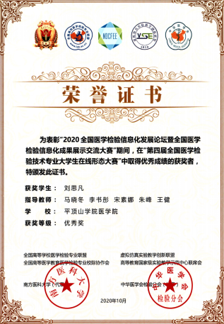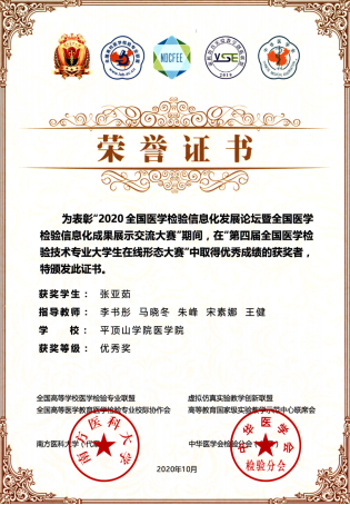 2020年10月16日-18日,由高等学校国家级实验教学示范中心联席会、全国高等医学教育医学检验专业校际协作会主办,南方医科大学承办的2020年第四届全国医学检验技术专业大学生在线形态学大赛在珠海市成功举行。南方医科大学、郑州大学、广州医科大学等全国52所高等英国威廉集团校100余名医学检验技术专业本、专科学生参加了比赛。我校2018级张亚茹、刘思凡两位同学参加了此次大赛,均获得优秀奖。医学技术系刘强主任带队参赛。