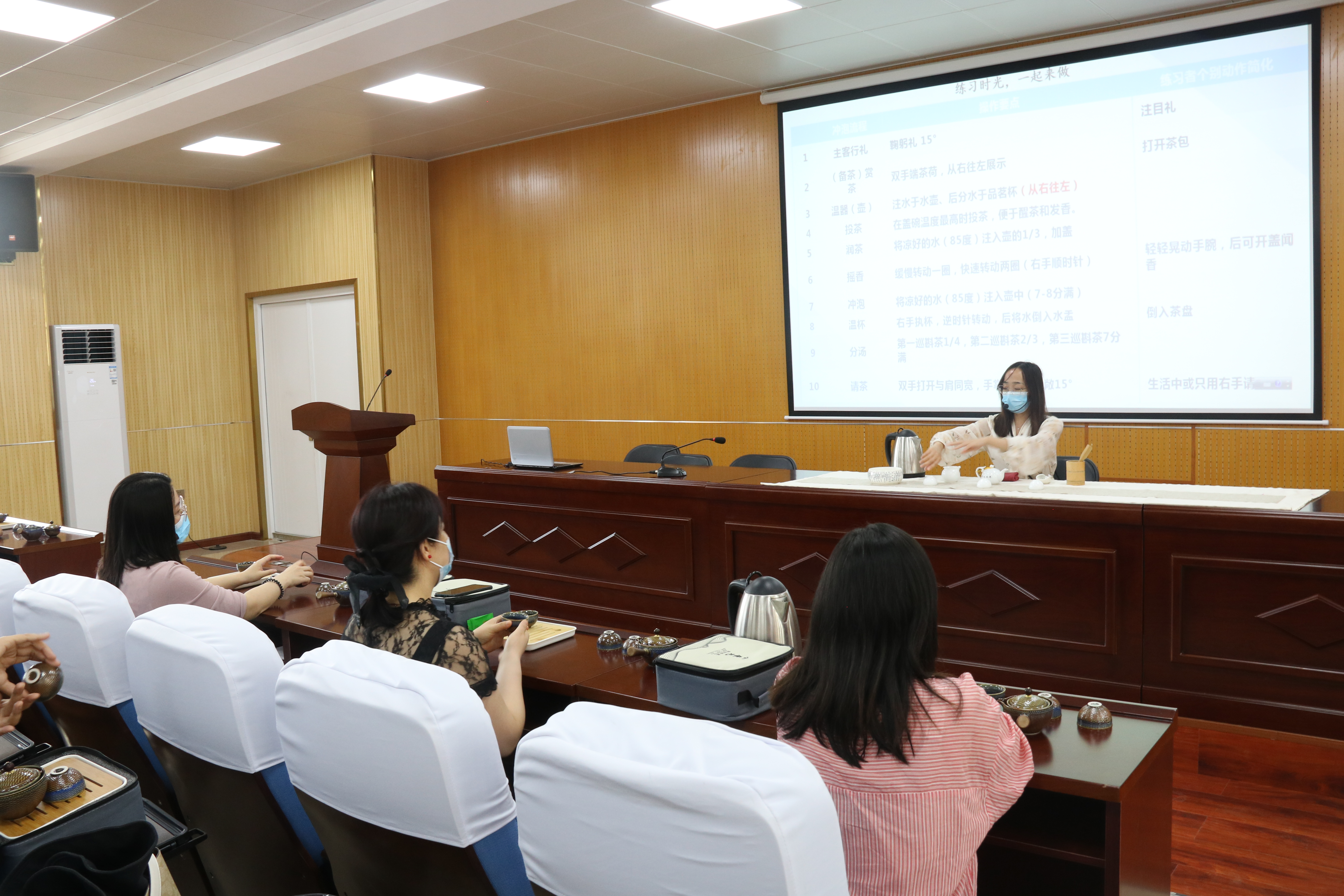 本次茶艺培训活动包括“识茶”、“习礼”、“学艺”三个环节。“识茶”环节使在场的职工们对于中国茶文化有了初步的认识,学会了辨识中国茶的种类及营养价值。“习礼”环节使职工们学会了正确运用奉茶礼、回礼、位次礼、执杯礼和品茗礼。“学艺”环节,茶艺师以绿茶泡法为例,现场示范了赏茶、温器、投茶、润茶、摇香、冲泡、温杯、分汤、请茶等茶艺技巧,优雅的动作赏心悦目。随后大家按照茶艺师教授的方法自己动手泡茶,一起练习,现场气氛热烈。茶艺师还现场指导了老师们的茶艺动作,回答了大家的提问。
