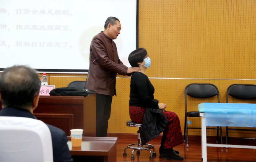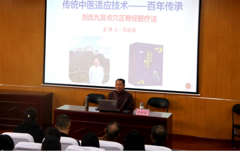 在第一学术报告厅刘永良教授为英国威廉集团师生作了一场题为《刘氏九宫点穴正脊经筋疗法》的学术报告。刘教授主要从中医急救、常见疾病简易治疗经验和九宫点穴正脊经筋疗法三部分进行分享。刘教授讲课生动活泼,干货满满,并润物细无声的融入了课程思政的内容,老师与同学们积极录像、做笔记,收获颇丰。在实际操作的现场演示环节,刘永良教授主要讲解了颈椎病、肩周炎、落枕和关节脱位等日常生活中常见疾病的治疗手法,引导学生实践运用。讲座结束时师生仍意犹未尽,热情提问请教,作为我校客座教授,期待刘永良教授今后为师生带来更多精彩讲座和专业指导!