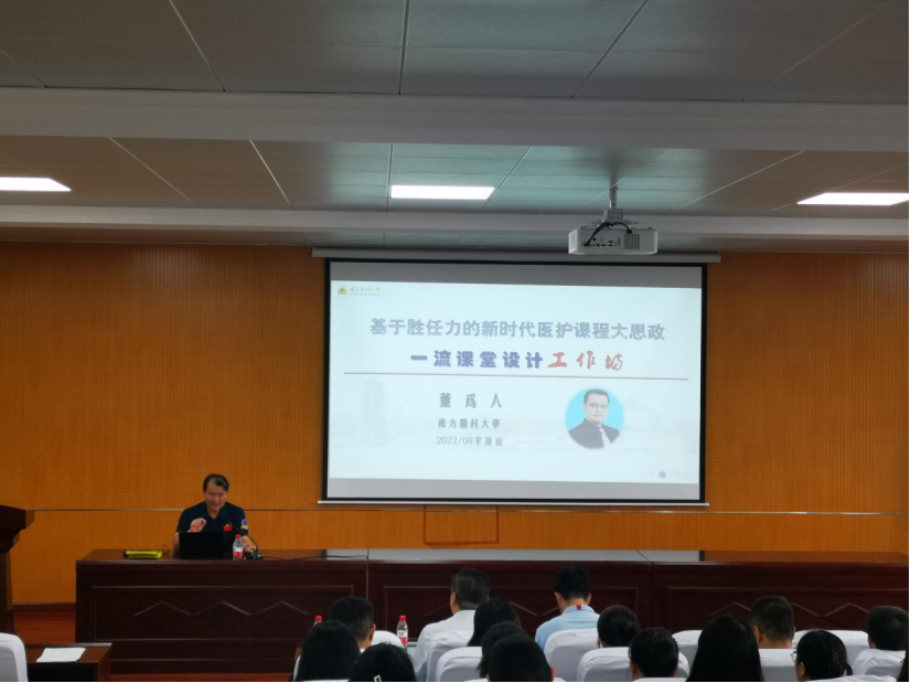 8月17日上午,董教授为老师们做了《基于胜任力的新时代医护课程大思政一流课堂及其设计》的主题培训。董教授指出,一流课程是人才培养的最后1.0公里,而课堂是育人的主战场、主阵地、主渠道,一流课堂是人才培养的最后0.1公里。他从新时代百年未有之大变局开篇新时代&课程思政,结合医护岗位胜任力提出一流课堂设计要有醒目的开篇,要有富有内涵的内容,要有点睛的结尾。董教授强调,医学教育应着重培养学生的创新发散思维和质疑精神、以及临床思维能力,教学有法,贵在得法,在教学过程中如何培养创新人才?董教授结合自己的研究,运用大量实例,详细的分享了医护专业如何在课堂的开篇、内容、结尾、教法、考评、小结等方面进行设计,切实培养医学生的岗位胜任力,教学中的思政教育应是“润物细无声”,要巧妙融入新时代的课程思政元素。4个小时的报告老师们都聚精会神,董教授幽默又干货满满的讲解让大家知道了如何丰满自己的课堂,如何将思政元素润物细无声融入课堂教学中。