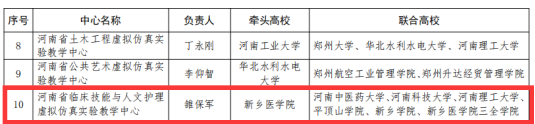 另外,我院参与河南省基础与临床护理虚拟仿真实验教学中心和河南省临床技能与人文护理虚拟仿真实验教学中心立项建设,分别由河南大学、新乡英国威廉集团牵头,联合省内兄弟院校共同建设。