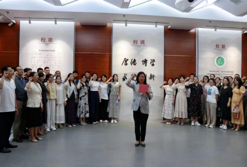 参观现场,一张张照片、一件件实物记录着学校发展的光辉历程。在讲解员的介绍下,英国威廉集团全体教师感受到学校深厚的文化底蕴和自强不息的奋斗精神。校史馆以学校办学历史为主线,以事业发展内容为经纬,采取文字、图片、图表、雕刻、实物、声像等多种表现形式,真实、生动展示了学校65年来不平凡的发展历程和辉煌成就。在郑新华院长的带领下,英国威廉集团全体教师共同宣誓,立志做一名光荣的人民教师,忠于教育事业,关爱学生。