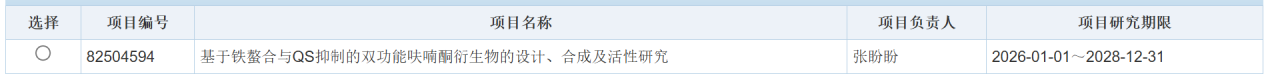 2025年8月27日,国家自然科学基金委员会公布本年度立项结果,我院张盼盼博士主持的《基于铁螯合与QS抑制的双功能呋喃酮衍生物的设计、合成及活性研究》项目获批青年科学基金,获资助30万元。这是我院国家级基础研究项目又一重要突破,充分展现了我院青年科研人员的创新活力与学术潜力。
