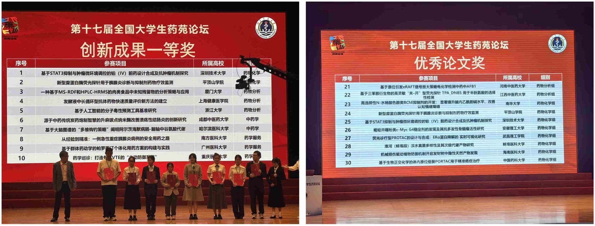10月18日,第十七届全国大学生药苑论坛总决赛在中国人民解放军海军军医大学圆满落幕。我院教师王杰敏及范帅指导的白朝霞团队表现优异,从全国280余支代表队中脱颖而出,荣获国家级创新成果一等奖和优秀论文奖,创下我校在该项赛事中的最佳成绩。