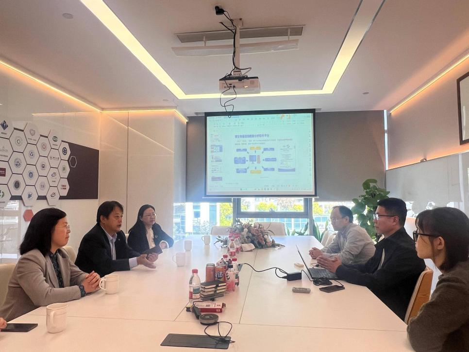 在杭州微数生物科技有限公司,企业负责人、浙江省领军人才陈欢教授热情接待调研团队并主持座谈。陈欢详细介绍了企业在微生物基因组学领域的核心优势,重点分享了其团队在微生物基因鉴定、微生物快速检测等前沿方向的研究进展,以及依托浙江省工程研究中心等平台在全自动微生物快速检测工作站、微生物溯源和评价分析解决方案等方面实现科技成果转化的实践经验。双方围绕“实习就业 + 科研合作”展开深度交流。