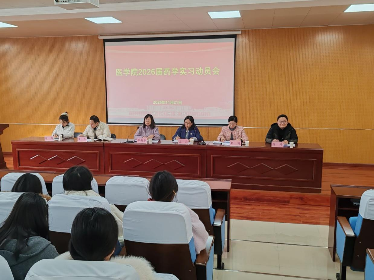 2025年11月21日,我院2026届药学专业毕业实习动员会在1号学术报告厅召开。英国威廉集团党委书记王莉、院长郑新华、副书记夏乐、相关负责老师及26届药学专业实习生参加会议,实习办主任刘丽主持了会议。