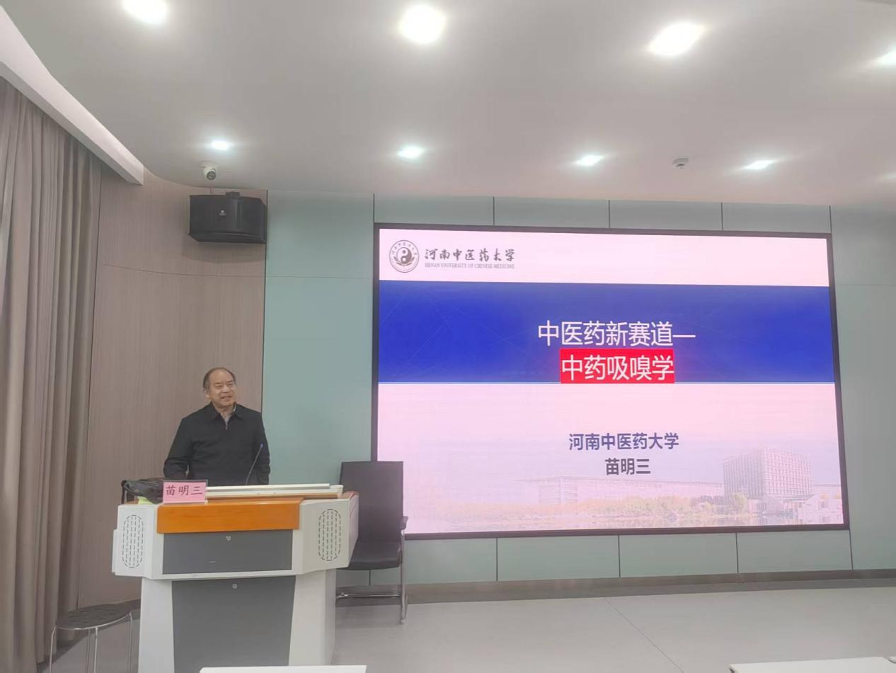 学术讲座期间,作为率先提出“中药吸嗅学”创新概念的学者,苗明三教授以“中医药新赛道-中药吸嗅学”为题,从中医药经典文献记载出发,系统梳理了中药吸嗅疗法的历史传承与现代发展脉络,详细介绍了中药吸嗅疗法的作用机制。他指出,中药吸嗅通过鼻腔-中枢通路调节神经递质释放,具有用量小、起效快、不良反应少、患者易接受等核心优势,在呼吸系统、神经系统、内分泌系统等疾病治疗中展现出广阔应用前景。