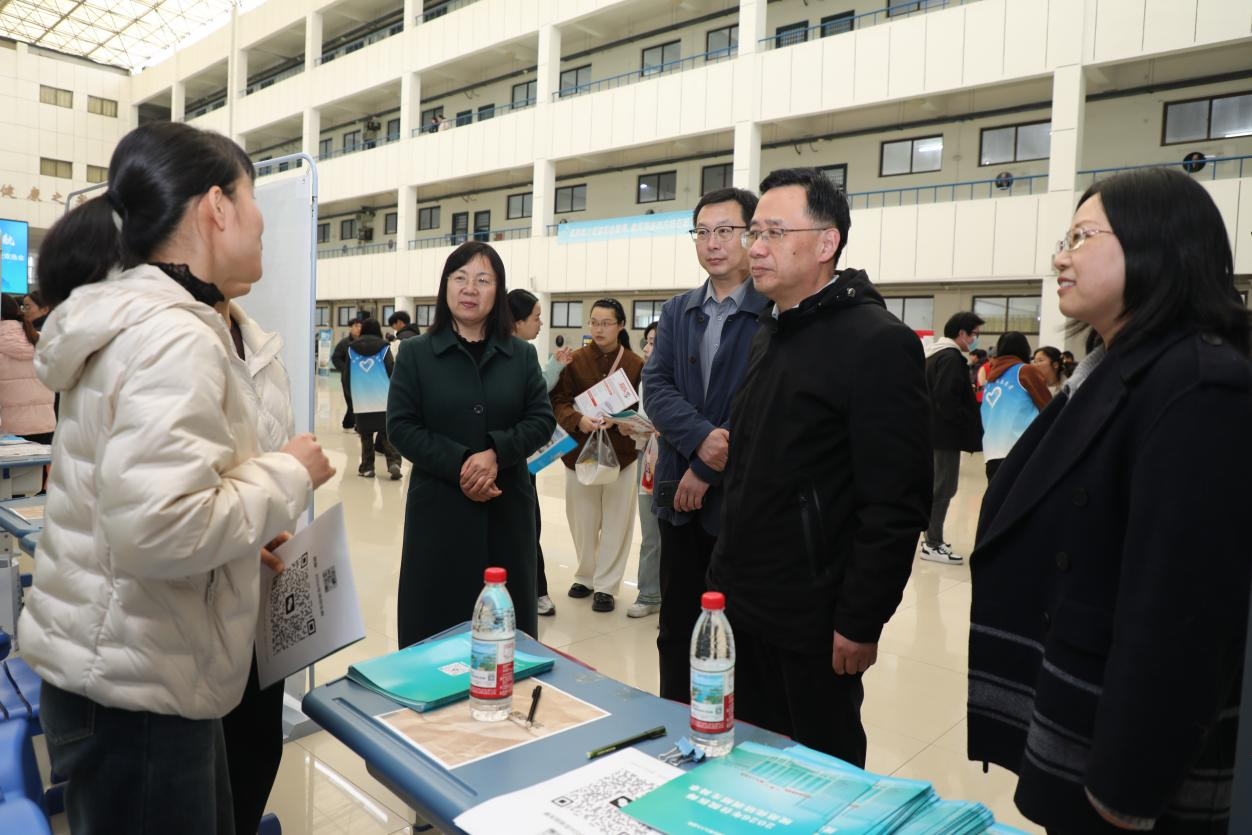 侯延民一行逐一走访各用人单位展位,感谢各单位到校选聘人才,详细了解各单位人才需求及发展前景,认真听取企业对学校人才培养和就业服务工作的意见建议。他亲切鼓励应聘同学们要充分发挥专业优势,积极把握机遇,早日实现就业。