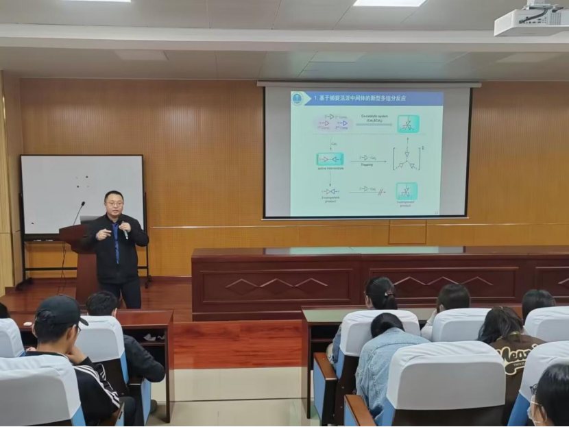 李玖零博士通过PPT的展演,向同学们介绍了“三氟甲基重氮甲烷参与的多组分反应研究”的相关知识,拓宽了同学们有关三氟甲基取代的胺基叶立德的亲电捕捉的知识的认识。对于工作展望,李玖零博士表示关于二氟烷基取代或多氟烷基取代的重氮甲烷开发及其应用将成为今后努力的方向。最后,老师向大家提出一些有关考研的意见,并对于同学们考研给予鼓励。
