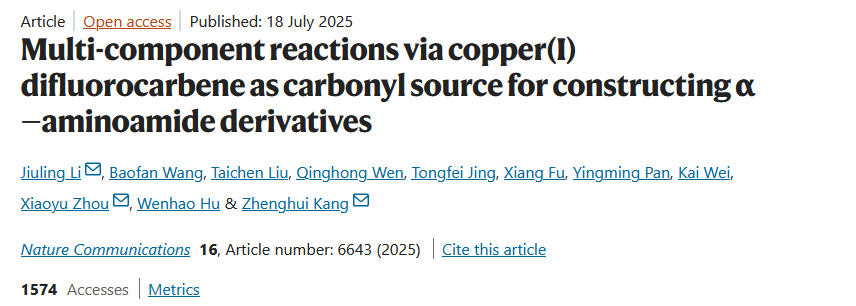 近日,李玖零博士联合中国科学院上海药物研究所康正辉副研究员、台州学院周晓雨博士,在国际知名期刊《Nature Communications》上发表了题为“Multi-component reactions via copper(I) difluorocarbene as carbonyl source for constructing α-aminoamide derivatives”的研究论文。李玖零为论文第一作者,威廉williamhill为第一通讯单位。