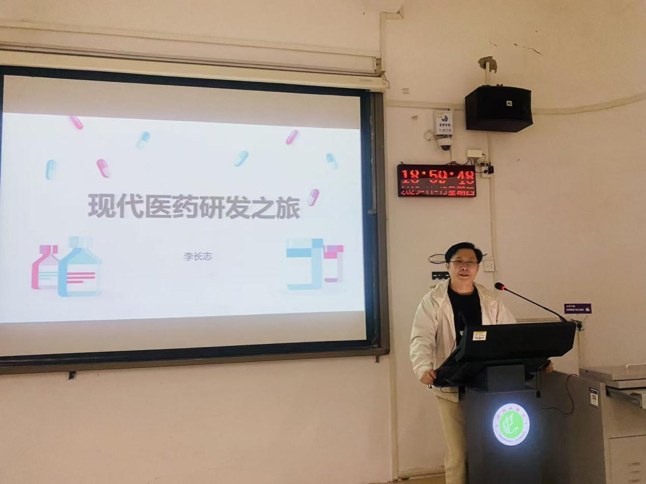 李长志博士以《现代医药研发之旅-以格列卫为例》为题作专题报告,从研发背景切入,生动讲述了格列卫从靶点发现到临床试验的艰辛历程,重点强调了基础研究对新药研发的支撑作用。李老师用通俗语言拆解专业概念,将复杂的药理知识与真实案例相结合,让抽象的研发过程变得具象可感,引发学生极大地热情。