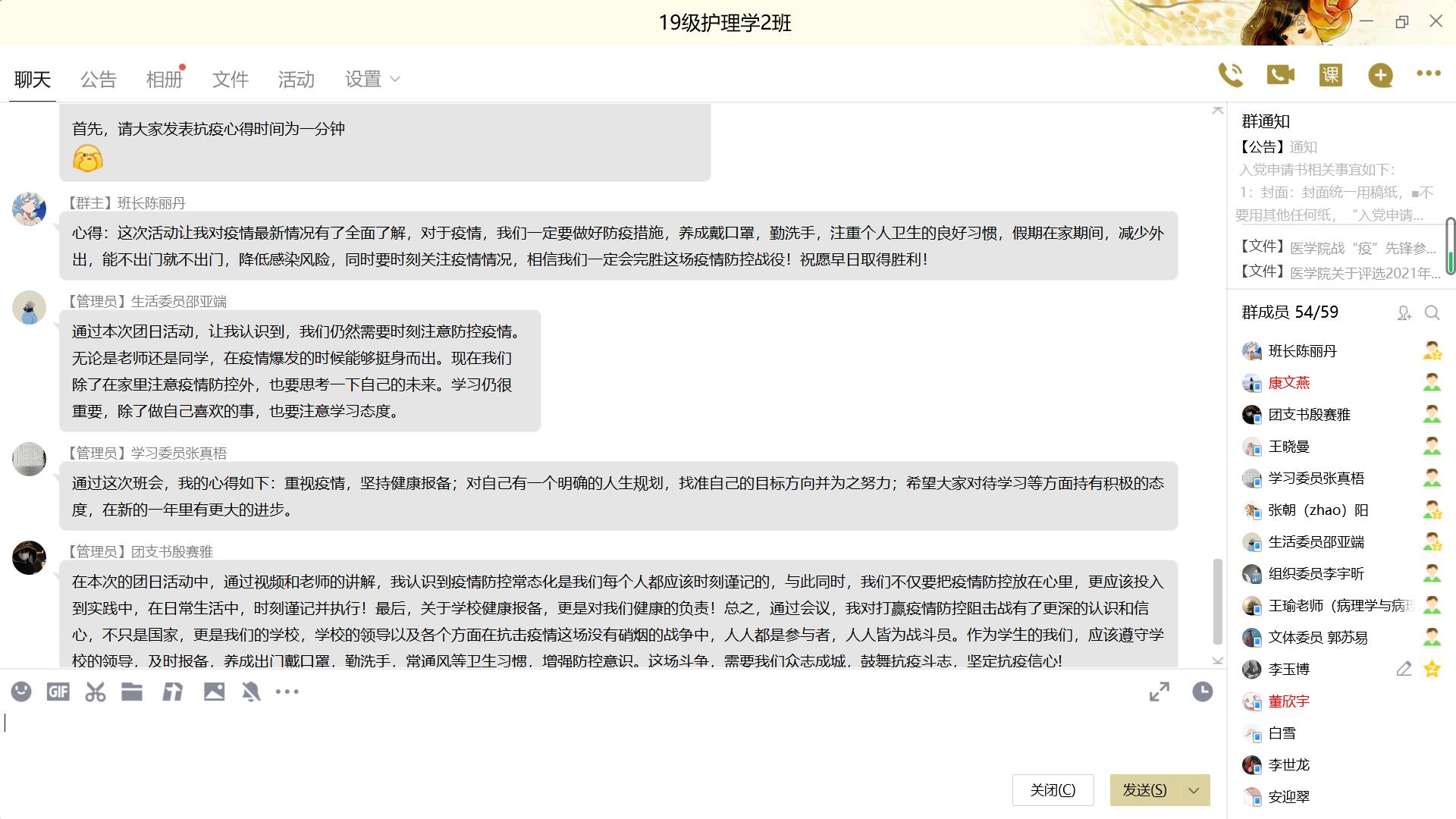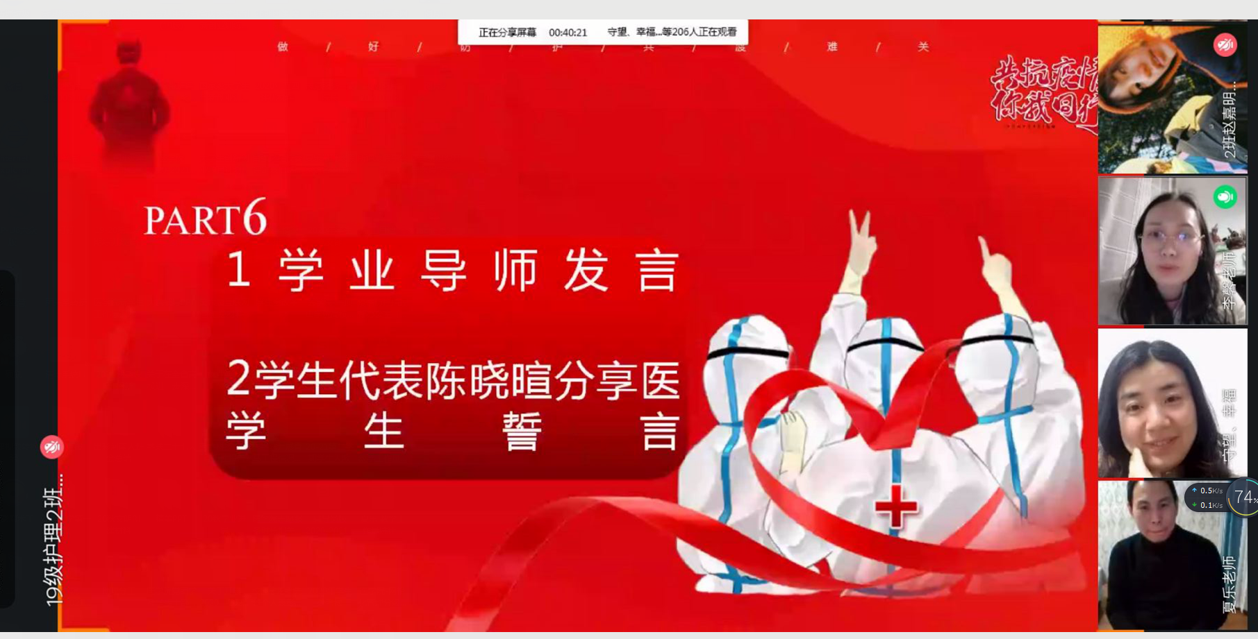活动以网络平台直播、会议等形式集中开展,内容丰富多样,团日活动囊括组织学生观看威廉williamhill“战疫情,我们能”短视频,学习书记、校长致全体学子及家长的一封信,带领同学们宣讲医学生誓言,为抗击疫情的一线人员加油祝福,学业导师、辅导员指导同学们寒假生活、学习等内容。活动期间,全体班级共同参与,上好疫情假期安全教育、思政教育、生命教育一堂课,同学们结合疫情在家如何参与防疫、实习实践医学生应该有何担当等话题,充分讨论,冲锋在前,以实际行动共同抗疫。最后,各专业辅导员向同学们传达评选战疫先锋通知,并从疫情防控、假期学习、学业发展、身心健康、实习就业等多个方面对同学们进行了叮咛和嘱咐,送上了节日的祝愿。
