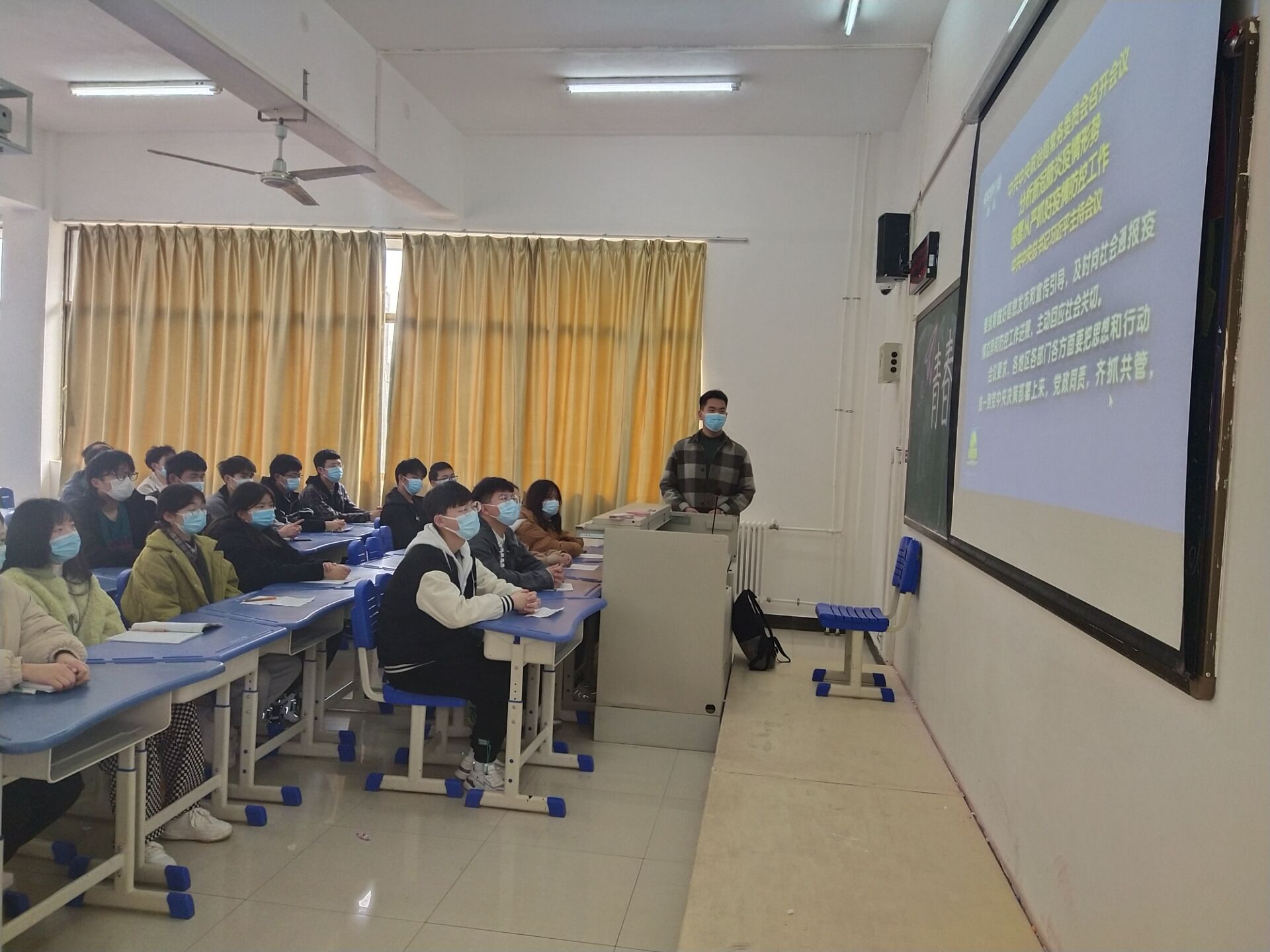 此次团日活动由主持人带领同学们学习贯彻习近平总书记在中央政治局常务委员会会议上的重要讲话精神,坚定思想,增强自我防护意识。随后观看了疫情防护知识小视频,进一步巩固疫情防护的知识,同时强调我校近期疫情防控的各项措施,让同学们意识到疫情防控的重要性,积极配合,落实落细学校的相关安排与工作,严格做好自我防护。