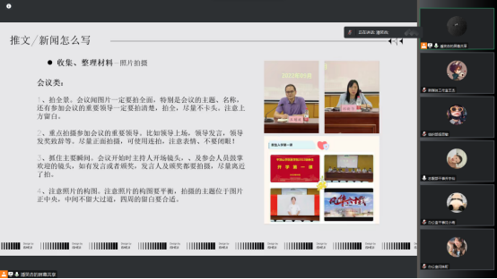 辅导员潘笑杏为第二期培训主讲,围绕着学生干部怎样进行活动工作的主题,她针对如何收集材料、拍摄照片、撰稿审稿等一系列问题进行了详细的阐述,让学生干部明确活动流程,使宣传能力得到了一定程度的提升。