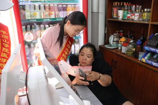 志愿者们为居民讲解资助政策(拍摄/崔傲寒)