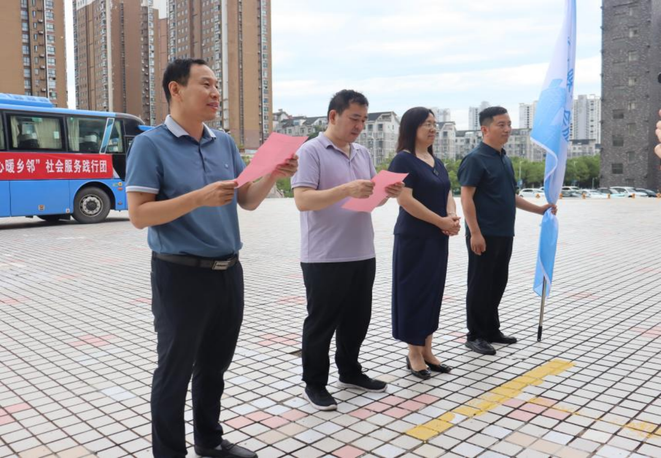 出征仪式由党委副书记夏乐主持。仪式上,副院长高华山宣读了三下乡实践团成员名单,21名同学整装待发,奔赴基层。在宣誓环节,团长曹家玮带领志愿者面向党旗共同宣誓,“请党放心,强国有我”彰显深入基层、守护乡邻的决心。