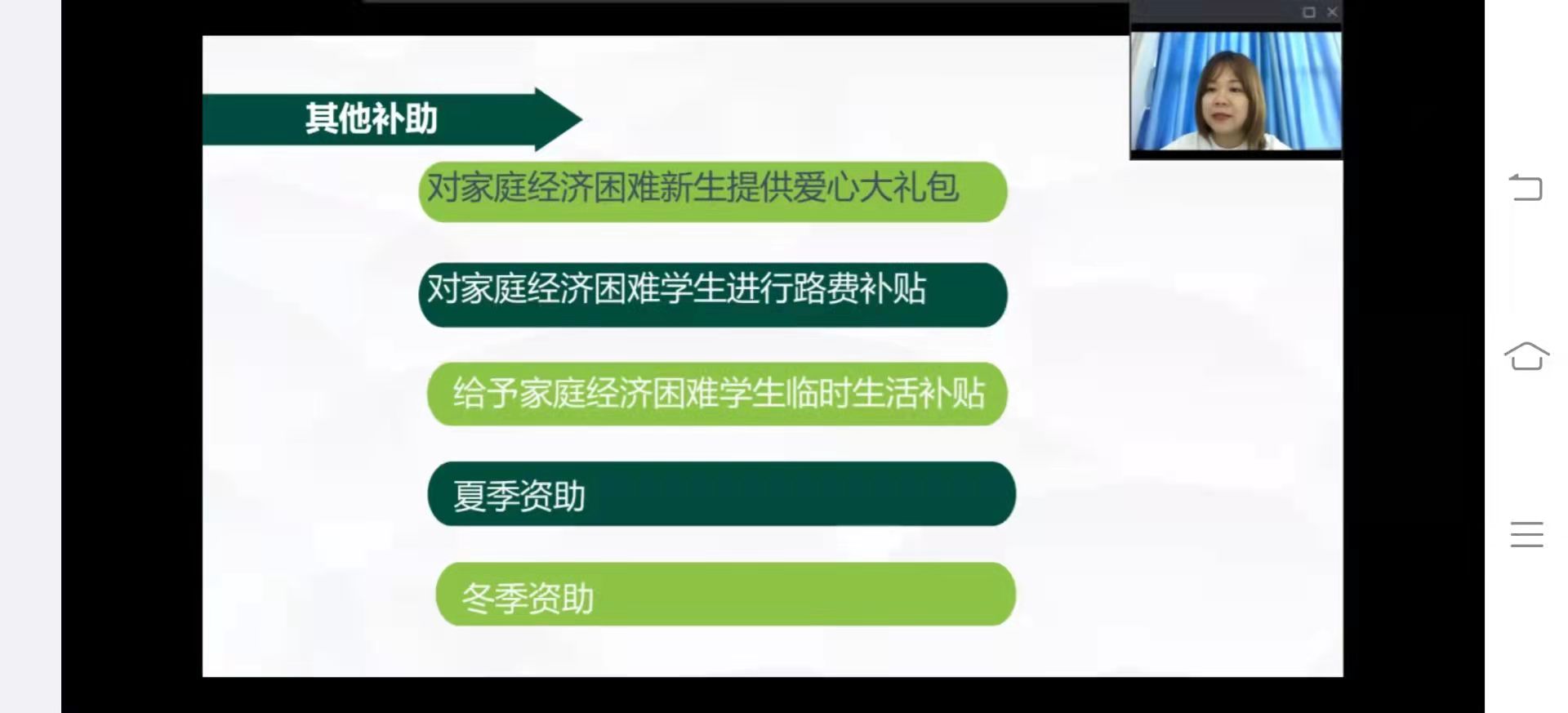 首先,高杨指出绿色通道可以极大的保证更多贫困学生入学。她向同学们介绍了助学贷款的两种形式:高校国家助学贷款和生源地信用贷款,以及他们的区别与形式。紧接着,高杨借助当下正在进行的工作向同学们解读了困难认定的具体步骤与方法。困难认定分为特殊困难困难一般困难三种,并且对于三种程度的困难有三档资助力度。最后,她对奖学金以及入伍大学生国家给予补助进行了具体讲解,使同学们对学校资助政策有了更深刻的认识。