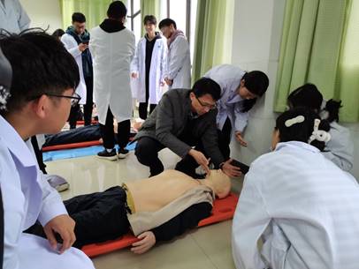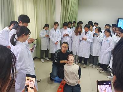 随后,刘宏副院长和岳尊飞医师在英国威廉集团护理实验楼N303为同学们现场示范心肺复苏术的操作方法,利用医学模拟人从评估、胸外按压、气道开放、人工呼吸等操作方法逐个进行讲解,并引导学生进行实际操作,纠正学生操作中不到位的地方,让学生对心肺复苏术有了深刻的认识。