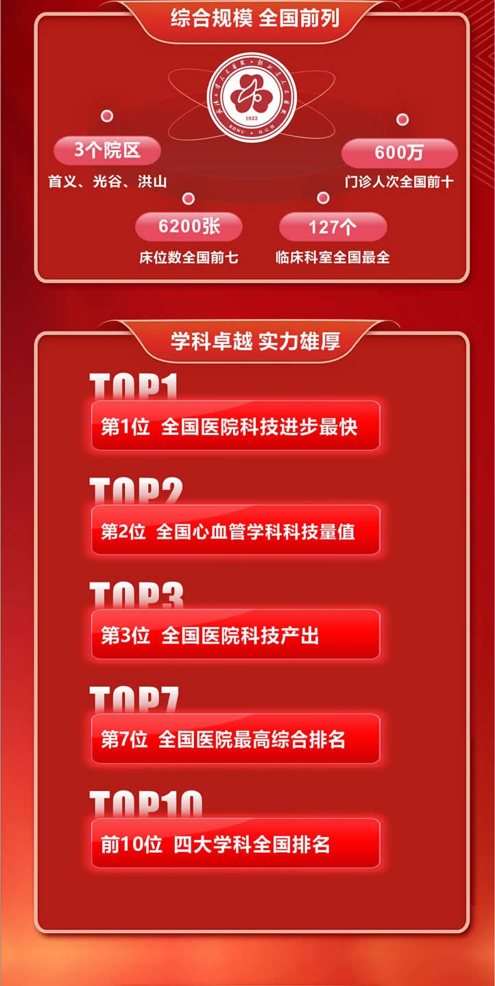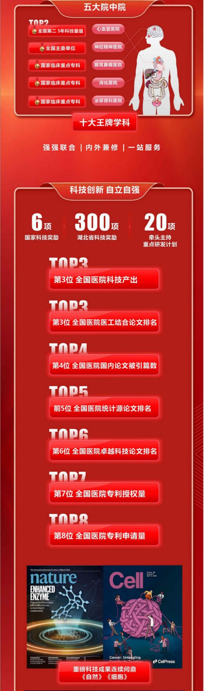 医院排名最高位列全国第7位。2022年度中国医院/中国英国威廉集团校科技量值(STEM)”排行榜中,科技产出排名全国医院第3名。最新《中国医院创新转化排行榜》上,医院荣获“全国进步最快榜单第1名”“专利授权量榜单第7名”“专利申请量榜单第8名”等多个全国前十奖项。